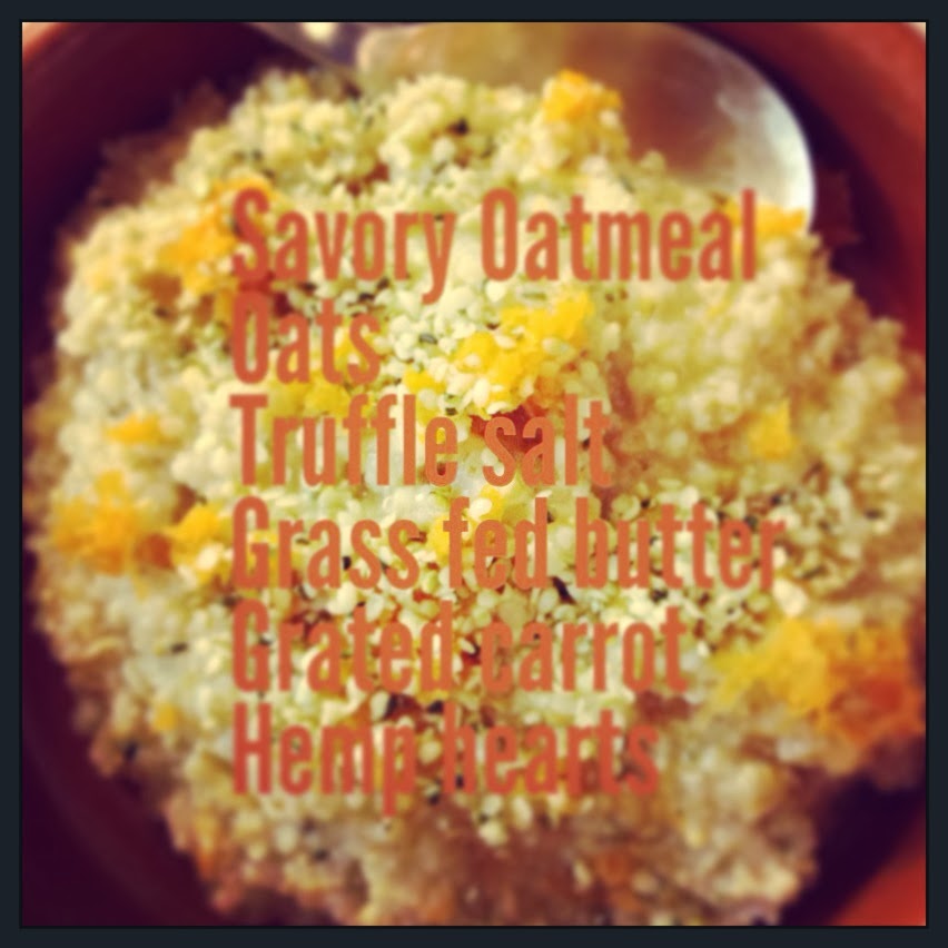 Unlike Tricia, I’m a little too lazy and time-strapped (in her defense she saves this breakfast for the weekend) to sauté onions in the AM so I tried my hand at easy savory oatmeal options. First I paired 1 serving of oats with truffle salt, grated carrots (slightly sweet but not with the ingredients it was hanging with) and Kerrygold butter (photo above). I was sold