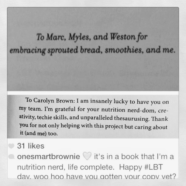 And for those of you who don’t have LBT yet (I’m assuming your book didn’t arrive because I know you ordered it, of course) I wanted to share the dedication to my family and my shout out to Carolyn (or maybe onesmartbrownie to you). I also think our snack queen (Joanna Li RD) is as excited about this project as I am. Feeling grateful.