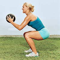 Stand with feet shoulder-width apart, holding a medicine ball (or other object if you don’t one) in front of chest with elbows bent next to body. Squat down, keeping weight over heels and ball in front of chest.Stand up explosively, extending arms overhead; keep elbows close to ears. Do 10 to 12 reps