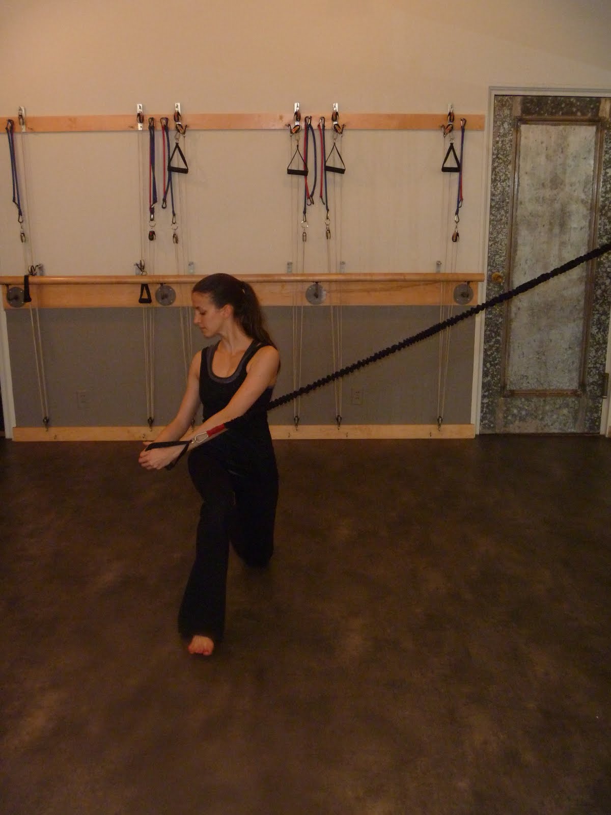 Attach a medium weight resistance band to a high sturdy object, such as a door or tree. Assume a half kneeling stance with your right foot forward and left shoulder in line with the band. Grab the band with two hands and tighten your abs and gluts. Keeping your hips still, chop the band diagonally down to your right hip and then slowly release back to your starting position. Your shoulders will follow the movement of the band, but your lower back and hips will remain stable. Perform 10-12 chops and then switch to the other side.