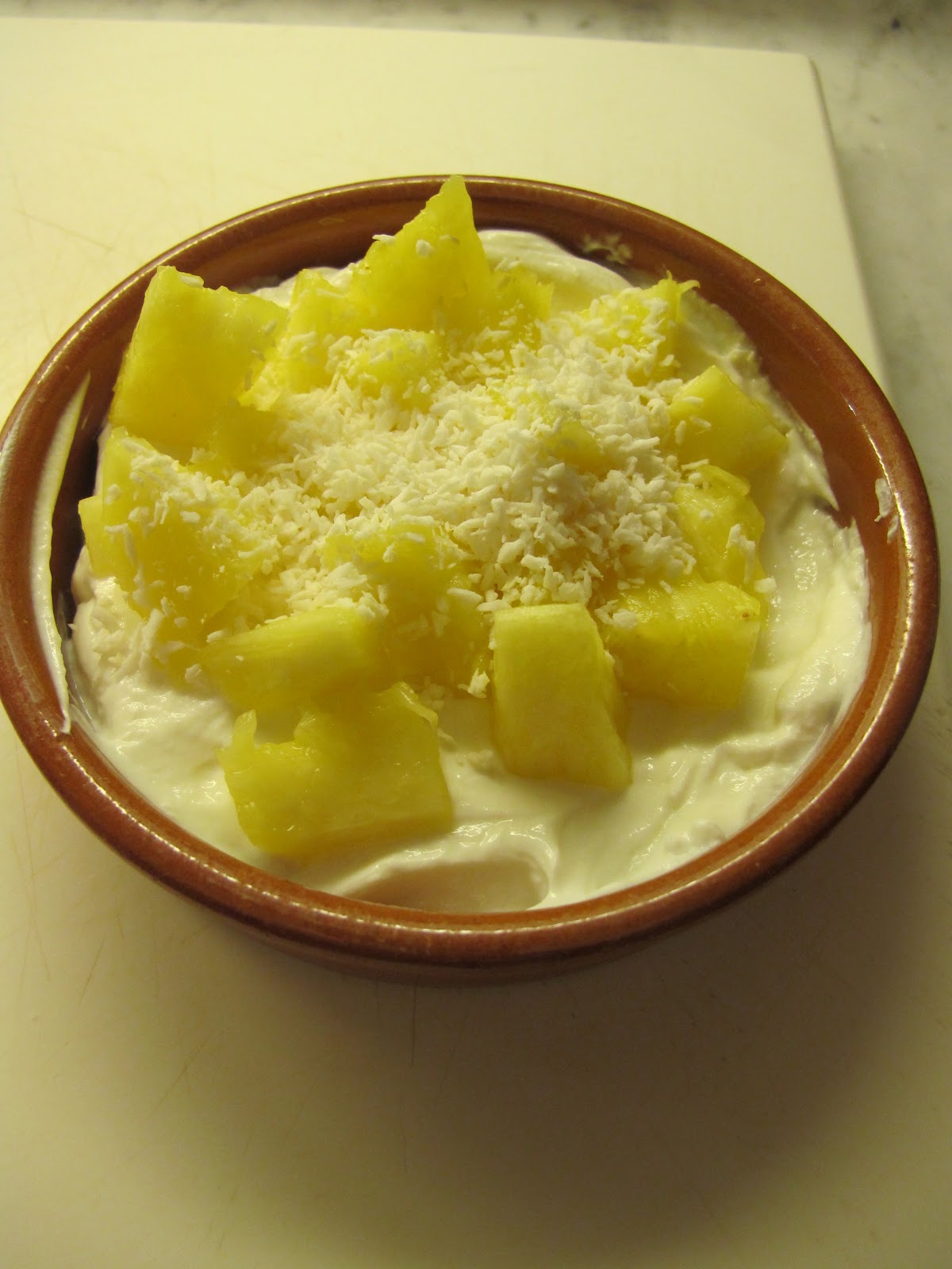 Stir together the yogurt, extract and sugar until blended. Top with coconut.