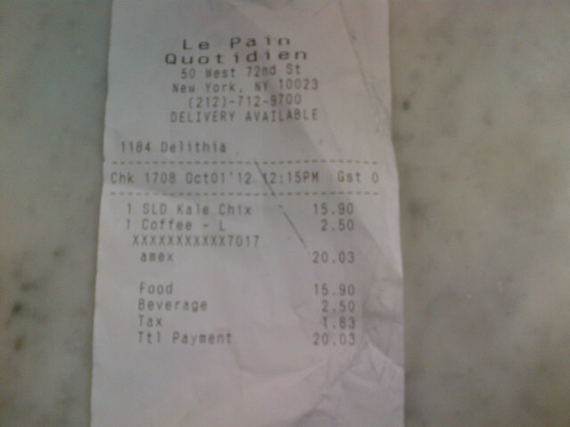 In case you can’t make it out I had kale salad and coffee. Organic salad and organic coffee but still, $20.03?